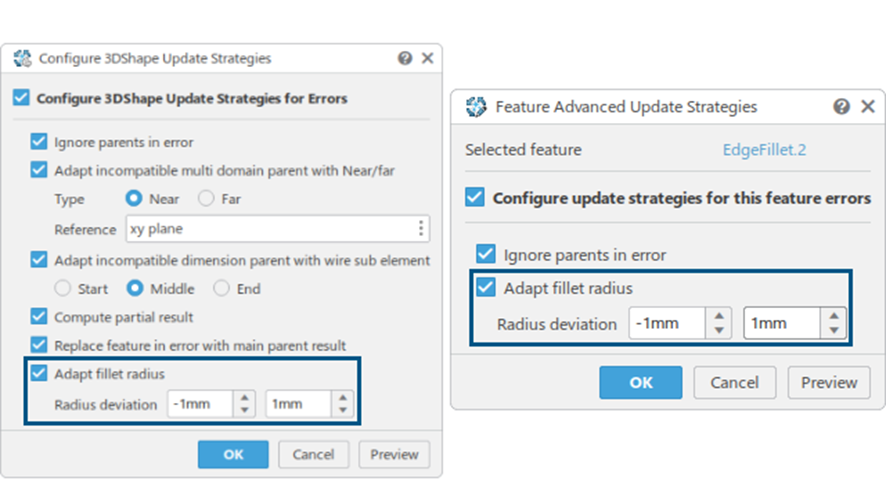 Para fazer isso basta selecionar a opção Adapt Fillet Radius no comando 3D Shape Update Modes ou Edit Update Modes na Toolbar Resilient Modeling e especificar os valores de desvio positivo e negativo do raio.
