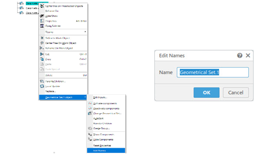 É possível renomear funcionalidades como Orderer Geometrical Sets, Geometrical Sets, PartBody, Axis System e Sketches.